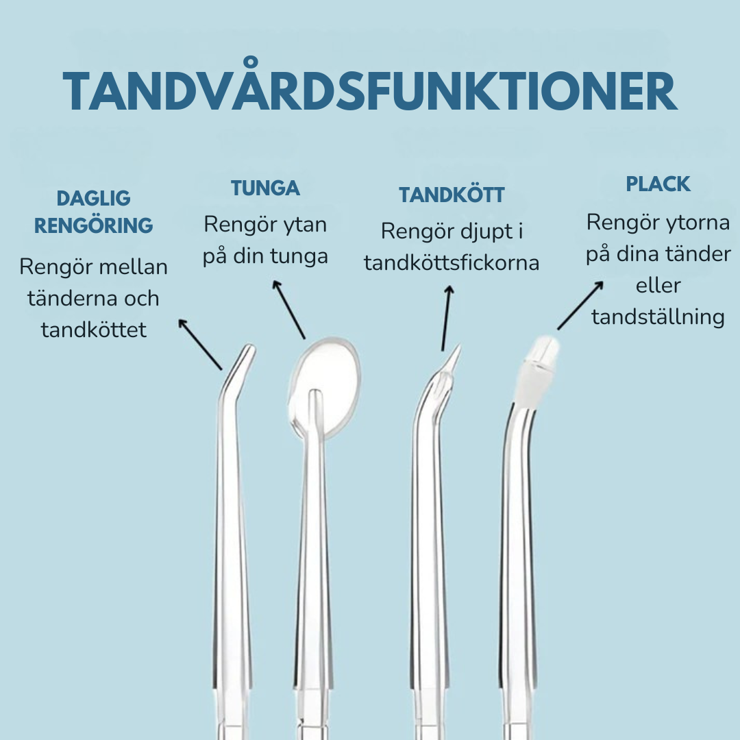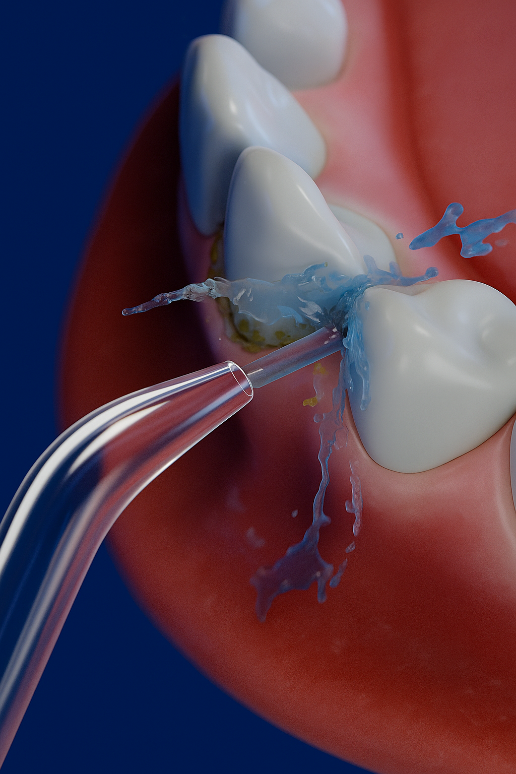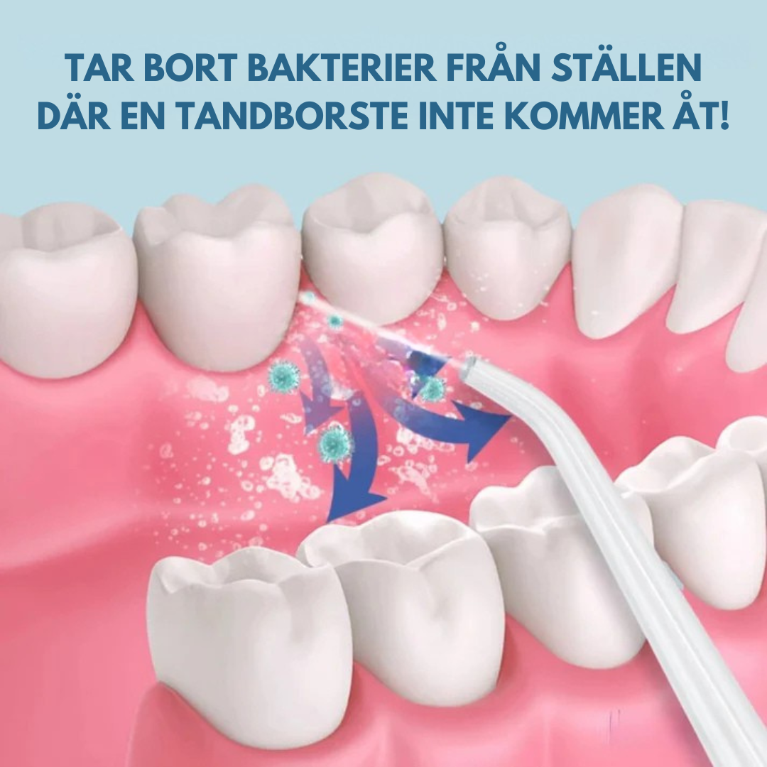 Vattenflossen tar bort matrester och bakterier med en riktad vattenstråle. Den når platser där tandborste eller tandtråd ofta inte kommer åt – som mellan tänderna och under tandköttskanten.