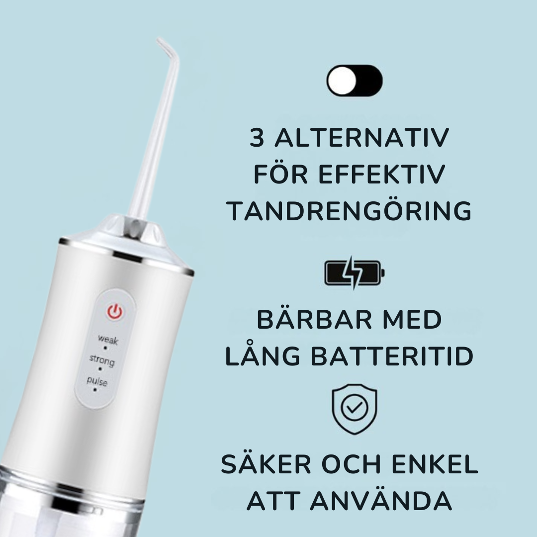 Även om det inte ersätter tandborstning, hjälper vattenflossen till att begränsa plack och hålla munhygienen på en bra nivå.