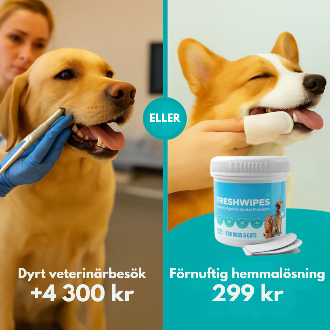 Fräsch andedräkt, starka tänder och en lyckligare fyrbent vän – det är vad FreshWipes ger. Med dessa enkla men effektiva tandservetter tar du bort plack och bakterier på ett ögonblick, utan stress eller krångel. De är utvecklade tillsammans med veterinärer och 100 % säkra för hundar av alla raser. Ge din hund den vård den förtjänar – varje svep gör skillnad.